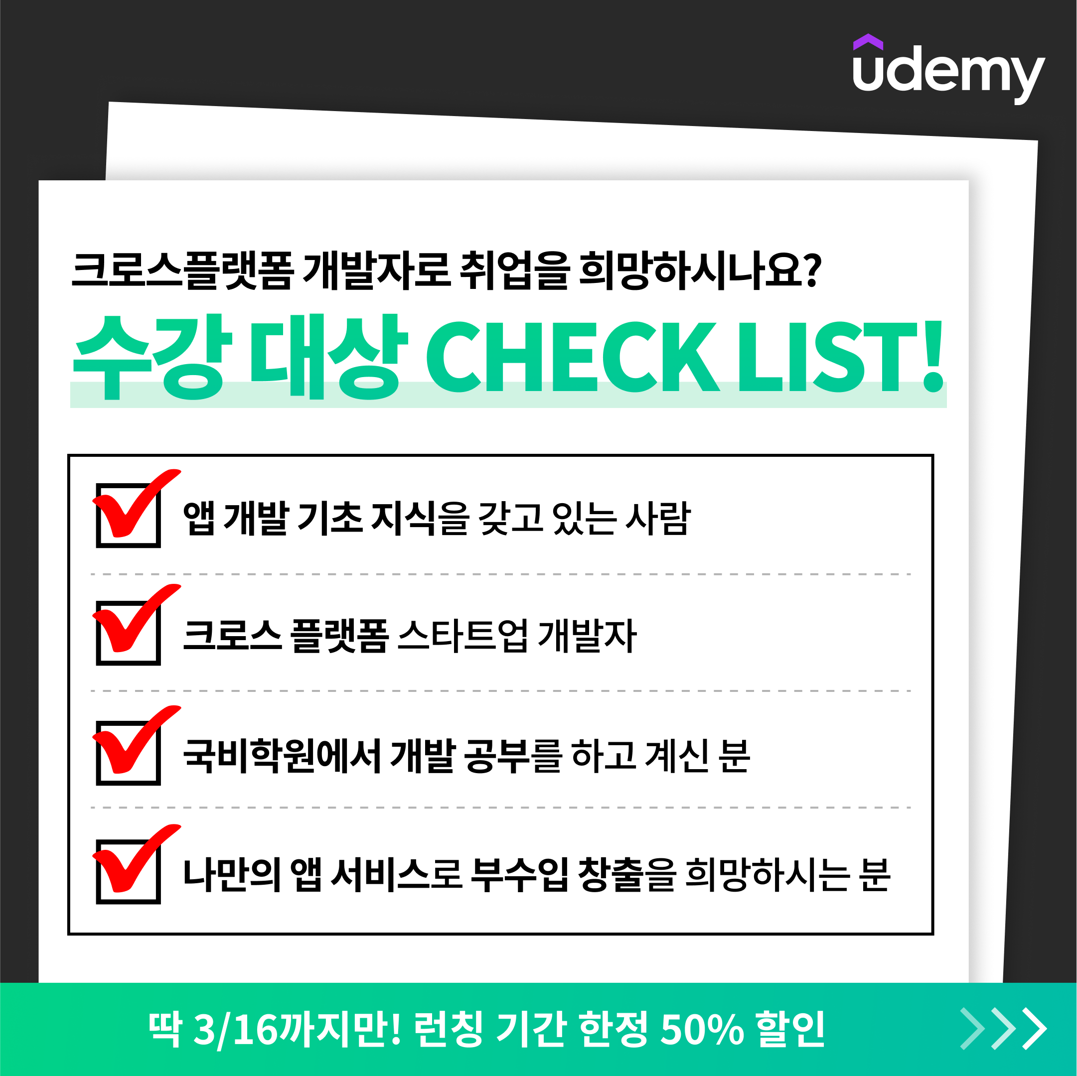 이번 연초에 크로스플랫폼 앱 개발에 관심이 많으셨던 분들은 꼭 수강신청을 하시기를 추천 드립니다.